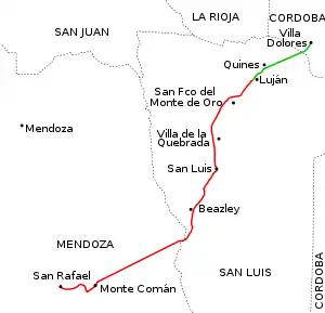 - Departamento San Rafael: Monte Comán (km 339), Goudge (km 386) y San Rafael (km 390-395).