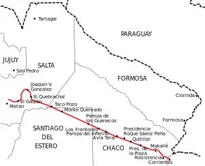 - Departamento Almirante Brown: Concepción del Bermejo (km 234), Pampa del Infierno (km 259), Los Frentones (km 285) y Río Muerto (km 311).
