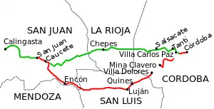 - Departamento Caucete: Pie de Palo (km 550), Caucete (km 555-558) y Villa Independencia (km 561).