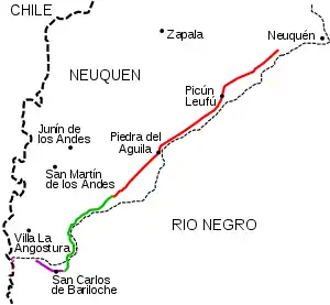 La Ley Provincial 2.135 de Río Negro vigente desde el 9 de enero de 1987 convalidó el Convenio suscripto entre la Dirección Nacional de Vialidad y Vialidad Provincial por la que la ruta al oeste del acceso al aeropuerto de San Carlos de Bariloche (km 1638-1676) pasaba a jurisdicción provincial.[4] Este camino se muestra en color morado en el mapa adjunto.