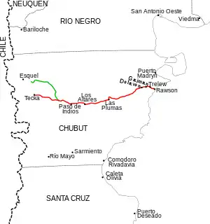 - Departamento Rawson: Rawson (kilómetro 0-1) y Trelew (km 17).