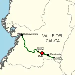 3201 | Buenaventura | El Pailón (Cruce 4001 ); Aeropuerto de Buenaventura; Zacarías; Río Dagua; Zabaletas; Río Anchicayá; San Marcos; LLano Bajo; Cascada El Amor y Huevos de Dragón. | ![]() |