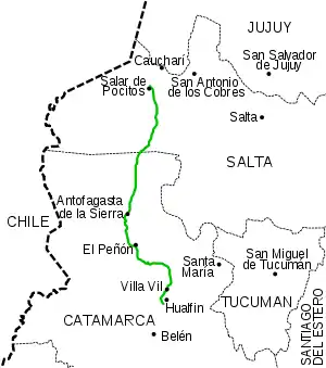 - Departamento Antofagasta de la Sierra: Incahuasi (km 123), Antofagasta de la Sierra (km 213), El Peñón (km 273).