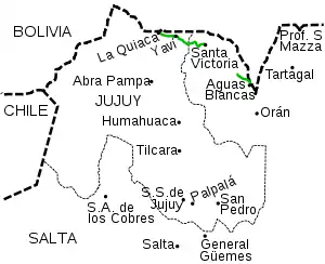 - Departamento Yavi: Suripugio (km 279), Yavi (km 293) y La Quiaca (km 310).