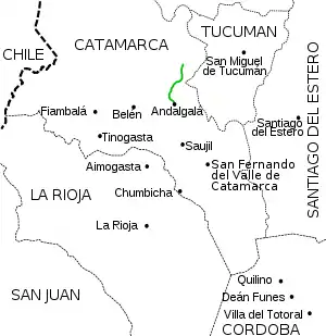 - Departamento Andalgalá: Andalgalá (kilómetro 0), Chaquiago (kilómetro 4), Choya (km 13) y Capillitas (km 54).