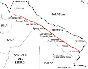 - Departamento Patiño: Comandante Fontana (km 1356), Ibarreta (km 1378), Estanislao del Campo (km 1408), Pozo del Tigre (km 1437) y Las Lomitas (km 1472).