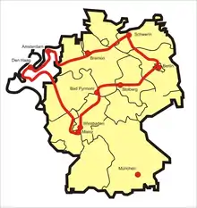 La ruta comienza en Países Bajos, de ahí, atraviesa luego los estados alemanes de Renania del Norte-Westfalia, Renania-Palatinado en dirección sur, gira hacia el noreste por Hesse, Baja Sajonia, Sajonia-Anhalt, Brandeburgo y Berlín, donde gira hacia el noroeste a Mecklemburgo-Pomerania Occidental, y finalmente hacia el suroeste por Schleswig-Holstein, de nuevo Baja Sajonia, y Bremen regresando a Países Bajos.[1]