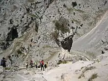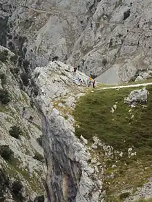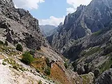 La ruta o senda del Cares es una ruta de senderismo del norte de España localizada en el parque nacional de los Picos de Europa —sendero de Pequeño Recorrido PR-PNPE 3[1]—, la ruta más concurrida de toda la cordillera Cantábrica. La ruta es parte de la antigua travesía que unía, siguiendo el profundo desfiladero que el corto río Cares ha tallado en el macizo, dos pequeños y remotos pueblos de montaña, el leonés de Posada de Valdeón y el asturiano de Poncebos. El sendero actual es el resultado del acondicionamiento y mejora en los años 1945-1950 de un camino que había sido construido para realizar un canal de alimentación de una pequeña central eléctrica inaugurada en 1921 en Camarmeña-Poncebos. Actualmente, una parte de la travesía, la que discurría entre Posada y Caín, ya puede hacerse por carretera y por eso apenas es recorrida. La ruta actual es el tramo de algo más de 12 km, estrictamente pedestre, que corresponde a Caín-Poncebos (o Poncebos-Caín): discurre a media altura en la parte más agreste del desfiladero —también conocido como «la garganta divina»—, excavado en las paredes casi verticales de caliza gris, la mayor parte del tiempo sobrevolando peligrosos precipicios sin protección alguna.
