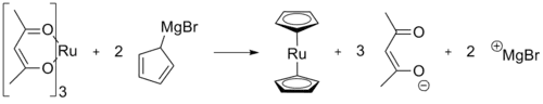 El rutenoceno fue sintetizado por primera vez en 1952 por Geoffrey Wilkinson, premio Nobel de química, que había colaborado en la asignación de la estructura del ferroceno solo un año antes.[3] Originalmente, el rutenoceno fue preparado por la reacción de tris(acetilacetonato)rutenio(0) con exceso de bromuro de ciclopentadienilmagnesio:[3]