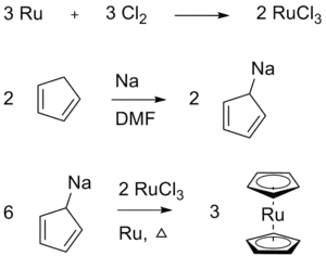 El rutenoceno también se puede preparar por reacción del ciclopentadienuro de sodio con cloruro de rutenio (preparado a partir de rutenio metálico y cloro in situ):[4]