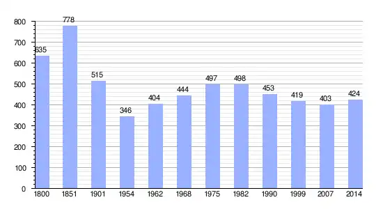 Los datos demográficos contemplados en este gráfico de la comuna de Ségrie-Fontaine[4] se han cogido de 1800 a 1999 de la página francesa EHESS/Cassini, y los demás datos de la página del INSEE.[5]