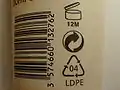 - Símbolo PAO junto con el Punto Verde y el código de identificación de plásticos en una botella de loción.