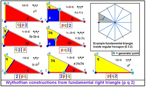 Los tres números en el símbolo de Wythoff, p, q y r, representan las esquinas del triángulo de Schwarz utilizadas en la construcción, que son π⁄p, π⁄q, y π⁄r radianes respectivamente. El triángulo también se representa con los mismos números, escritos (p q r). La barra vertical en el símbolo especifica una posición categórica del punto generador dentro del triángulo fundamental de acuerdo con lo siguiente: