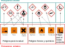 Los actuales pictogramas que representan la peligrosidad de los diferentes productos químicos en España se rigen por el Real Decreto 1802/2008, de 12 de noviembre, por el que se modifica el reglamento sobre notificación de sustancias nuevas y clasificación, envasado y etiquetado de sustancias peligrosas, que trasladó la norma europea, es decir el Reglamento (CE) nº 1272/2008 (CLP Clasificación Labelling and Packaging of substances and mixturas),[1] que deroga las anteriores directivas a la legislación española. Según esta norma, son los siguientes: