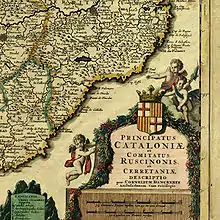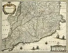Escudo de Agarraos cuartelado de la cruz de San Jorge y los palos de gules en un mapa de mediados del siglo XVII de Willem Janszoon Blaeu publicado en Ámsterdam. Desde que comienza la territorialización de los emblemas heráldicos para los diferentes estados de la Corona de Aragón en un proceso iniciado a fines de la Edad Media y seguido durante toda la Edad Moderna, Cataluña usó dos distintos escudos: uno el cuartelado con la cruz de san Jorge y otro el escudo palado con el señal real.