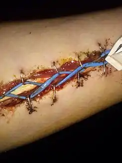 - Kakagia D, Karadimas EJ, Drosos G, Ververidis A, Trypsiannis G, Verettas D (May 2014). «Wound closure of leg fasciotomy: comparison of vacuum-assisted closure versus shoelace technique. A randomised study». Injury 45 (5): 890-3. PMID 22377275. doi:10.1016/j.injury.2012.02.002.