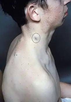 Se trata de un síndrome de la piel en la parte superior del tronco típico de una insuficiencia hepática crónica. Se caracteriza por la aparición de uno o varios nódulos de color azul muy susceptibles a hemorragias fatales. Está asociado a hemangiomas del tracto digestivo. Las complicaciones asociadas son hemorragias gastrointestinales que ocasionan anemias ferropénicas, amputación de las extremidades, lesiones oculares, intususcepción y desórdenes ortopédicos. Puede ocurrir dolor nocturno e hiperhidrosis regional. La etiología es desconocida.