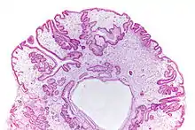 Los pólipos son similares a los del síndrome de poliposis juvenil. Suelen ser sésiles,[2] con dilatación glandular, edema del estroma e inflamación eosinofílica.[4] La tinción para el subtipo de anticuerpo IgG4 es positiva debido a la infiltración de células plasmáticas que lo producen.[5]