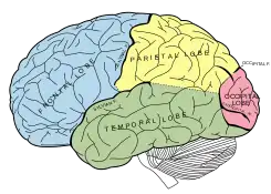 ![]() Principales fisuras y lóbulos cerebrales vistos lateralmente. El lóbulo parietal se muestra en amarillo | ||