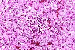 ![]() Histopatología de un hígado autópsico procedente de un niño que murió de síndrome de Reye. Los hepatocitos se tiñen pálidamente debido a las gotitas intracelulares de grasa. | ||