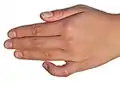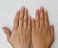 - Braquidactilia, en este caso del dedo meñique debido a braquifalangismo de la falange media.