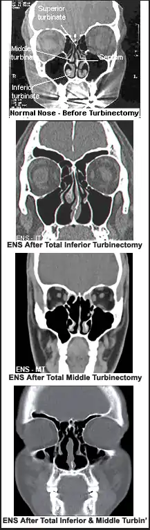 ![]() La primera imagen muestra un TAC de un sujeto con la anatomía nasal normal. Las tres siguientes imágenes muestran las de pacientes que padecen el SNV tras haberse sometido a turbinectomías de los cornetes inferiores, medios e inferiores y medios, respectivamente. | ||