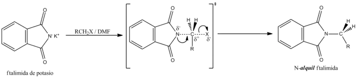 La ftalimida de potasio reacciona con un halogenuro de alquilo primario o secundario mediante un mecanismo de reacción SN2. La reacción ocurre en un solo paso sin intermediarios de reacción.[1]