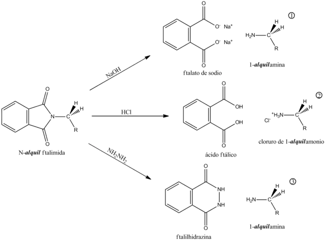 - 3) Tratamiento con NH2NH2: Los productos de la reacción, en este caso, serán ftalilhidrazina y alquilamina.[2]