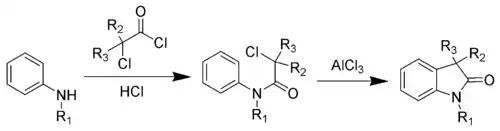 El primer paso es el ataque del nitrógeno de la anilina al carbonilo de cloruro de ácido. El segundo paso es una reacción de Friedel-Crafts.[5][6] Se ha desarrollado un procedimiento mejorado.[7][8]