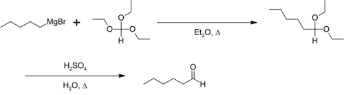 La reacción del reactivo de Grignard con ortoformiato de trietilo da como producto un acetal, que puede ser hidrolizado a un aldehído. Por ejemplo, la síntesis de n-hexaldehído.[1]