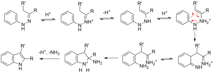 La reacción de una fenilhidrazina (sustituida) con un carbonilo (aldehído o cetona) forma inicialmente una fenilhidrazona que isomeriza a la enamina respectiva (o 'eno-hidrazina'). Después de la protonación, se produce una transposición sigmatrópica produciendo una imina. La imina resultante forma un aminoacetal cíclico (o aminal), que bajo el catálisis ácido elimina NH3, dando como resultado la indol aromático energéticamente favorable.