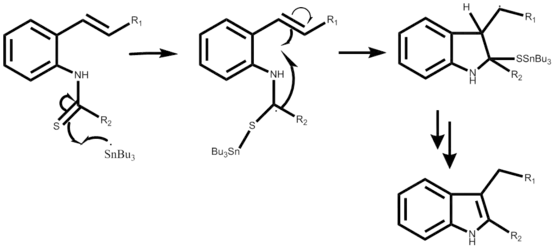 El mecanismo que usa 2-alqueniltioanilida es muy similar, comenzando también con la formación de un enlace, ahora entre el radical estaño y el azufre. Seguido de una ciclación radical similar que resulta en un anillo de cinco miembros, se produce un nuevo radical de estaño y el radical atacante original se va con el sustituyente de azufre. Esta parte del mecanismo paso a paso aún no se ha detallado. El rendimiento de la reacción puede variar del 40% al 93% dependiendo también del sustituyente deseado.