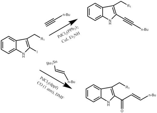 La síntesis de Fukuyama Indole puede generar un rango de diferentes sustituyentes en la posición 2,3 que antes no se podían obtener sin un grupo protector en el nitrógeno en el anillo. Un ejemplo de ello es el derivado de 2-yodoindol, que puede conducir a una variedad de indoles sustituidos 2,3 no protegidos con N. Antes del descubrimiento de este compuesto, la química que involucraba 2-stannylindoles no se desarrolló ya que no había forma de sintetizar prácticamente estos 2,3-stannylindoles sin protección N. Uno se limitó a la producción de 2-stannylindoles N-protegidos a través de la metalación mediante un proceso conocido como acoplamiento de Stille. [6] Los 2-estanilindol no protegidos N generados a partir de la síntesis de Fukuyama se pueden oxidar fácilmente con yodo abriendo un área química que permite la síntesis de una variedad de compuestos que utilizan los 2-yodoindol como reactivo de partida. Este derivado sustituido con yodo puede conducir a haluros de arilo, yoduros de vinilo, triflatos de vinilo, bromuros de bencilo.