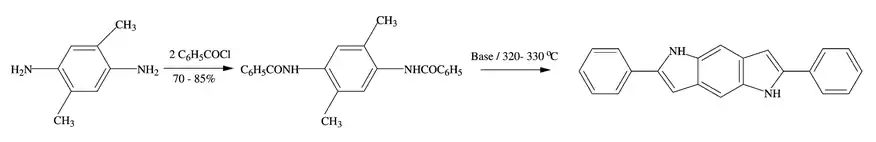 Otra faceta a través de la cual la síntesis de Madelung ha sido útil es la síntesis de 2,6-difenil-1,5-diaza-1,5-dihidro-s-indaceno, a partir de 2,5-dimetil-1,4-fenilendiamina..[4]