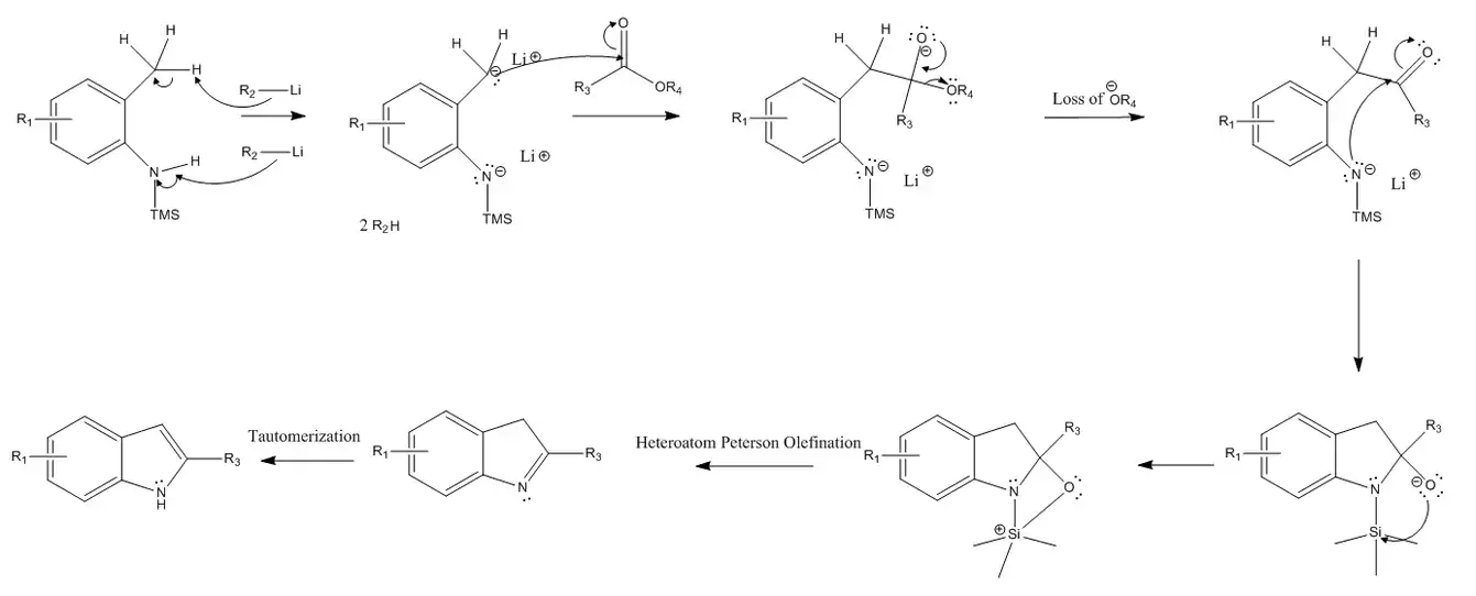 La síntesis de indol de Smith comienza con el uso de dos equivalentes de un reactivo de organolitio (ya que los reactivos de organolitio son bases muy fuertes) para extraer un hidrógeno tanto del sustituyente alquilo como del nitrógeno, lo que resulta en una carga negativa en ambos. La síntesis continúa con un ataque nucleofílico del carbanión sobre el carbono carbonílico electrofílico del éster o ácido carboxílico. Cuando esto ocurre, el enlace pi del electrófilo se convierte en un par solitario en el oxígeno. Estos pares solitarios se reconvierten nuevamente en un enlace pi, lo que resulta en la expulsión del grupo -OR. A continuación, el nitrógeno cargado negativamente realiza un ataque nucleófilo sobre el carbono carbonílico electrófilo adyacente, lo que hace que el enlace pi del electrófilo se convierta en un par solitario en el oxígeno. Este oxígeno cargado negativamente realiza un ataque nucleófilo en el átomo de silicio del grupo trimetilsililo (TMS), lo que resulta en un compuesto tricíclico y un átomo de silicio cargado positivamente y un átomo de oxígeno neutro. La síntesis avanza a través de una olefinación intramolecular de heteroátomo de Peterson, que finalmente produce una reacción de eliminación que expulsa un grupo TMSO y forma un enlace pi en el anillo de cinco miembros en el átomo de nitrógeno. Luego, se produce el tautomerismo cetoenólico, que da como resultado el producto deseado.