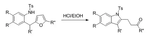 En una versión intramolecular de la reacción de Reissert, una apertura de anillo de furano puede proveer el carbonilo necesario para la ciclación en la formación del indol. En el producto final, se forma una cetona como sustituyente, permitiendo modificaciones posteriores.[4]