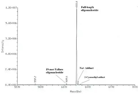- Para obtener información más detallada de la impureza del perfil de los oligonucleótidos se usa la cromatografía líquida de masa (LC-MS o HPLC-MS)[120] o electroforesis capilar de espectometría de masa(CEMS)[121]