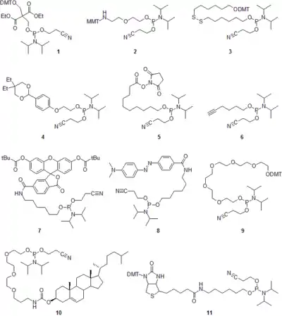 Los fosforamitos no nucleosídicos son usados para introducir los grupos deseados que no están disponibles en los nucleósidos naturales o que pueden ser introducidos de manera más fácil usando diseños químicos más simples. En el esquema para la demostración de la diversidad estructural y funcional disponible se puede ver una pequeña selección de reactivos de fosformaidito comercial. Estos reactivos sirven para la unión del fosfato 5'-terminal (1),[53] NH2 (2),[54] SH (3),[55] aldehído (4),[56] y grupos carboxílicos (5),[57] CC triples enlaces(6),[58] marcadores no radioactivos y desactivadores (ejemplificados por 6-FAM amidita 7[59] para la fijación de fluoresceína y DABCYL amidita 8,[60] respectivamente), modificadores hidrofílicos e hidrofóbicos (ejemplificados por hexaetilenglicol amidita 9[61][62] y colesterol amidita 10,[63] respectivamente) y amidita biotina 11.[64]