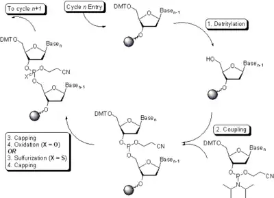 La síntesis de oligonucleótidos se lleva a cabo por una adición gradual de residuos de nucleótidos al extremo 5' de la cadena creciente hasta que la secuencia deseada sea ensamblada. Cada adición tiene que ver con un ciclo sintético (esquema 5) y consiste en cuatro reacciones químicas: