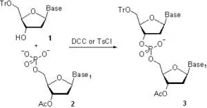 En la década de 1950, Har Gobind Khorana y sus colaboradores desarrollaron un método de fosfodiéster donde el 3’-O-acetilnucleósido-5’-O-fosfato 2(Esquema 3) se activaba con N,N’-diciclohexilcarbodiimida (DCC) o cloruro de 4-toluensulfonilo (Ts-Cl) y un nucleósido 5’-O protegido 1 se hizo reaccionar con la especie activada para dar un monofosfato de dinucleósido protegido 3.[21] Tras la eliminación del grupo acetilo 3’-O usando hidrólisis alcalina, se llevó a cabo una posterior elongación de la cadena. Siguiendo esta metodología, se sintetizaron conjuntos de tri- y tetradeoxirribonucleótidos, los que fueron convertidos enzimáticamente en oligonucleótidos más largos, lo que permitió la elucidación del código genético. La principal limitación del método del fosfodiéster consistía en la formación de oligómeros de pirofosfato y oligonucleótidos ramificados en el fosfato internucleosídico. El método parece ser un paso atrás desde la química más selectiva descrita anteriormente; sin embargo, en aquel entonces, no habían sido introducidos la mayor parte de grupos protectores de fosfato que hay hoy en día. La falta de una estrategia de protección conveniente necesitaba tomar una retirada a una química más lenta y menos selectiva para lograr el objetivo último del estudio.[2]