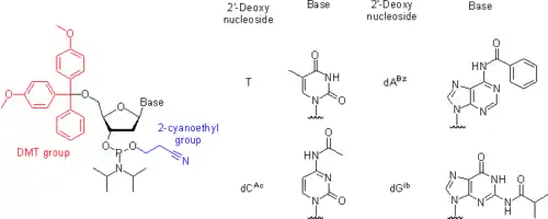 - La guanosina y la 2'-deoxiguanosina tienen un grupo amino exocíclico, su basicidad es baja al grado en el que no reacciona con fosforamiditos bajo las condiciones de una reacción de copulación. Sin embargo, un fosforamidito derivado de N2-no protegido 5'-O-DMT-2'-desoxiguanosina es poco soluble en acetonitrilo, el solvente que es comúnmente usado en la síntesis de oligonucleótidos.[38] En contraste, las versiones de N2-protegidas del mismo compuesto son solubles en acetonitrilo y por lo tanto son muy usadas. Las bases nitrogenadas adenina y citosina tienen grupos amino exocíclicos reactivos con los fosforamiditos activados bajo las condiciones de una reacción de copulación. Bajo el uso de pasos adicionales en el ciclo de sintetización[39][40] o agentes alternativos de copulación y sistemas de solvatación,[38] el ensamblaje de la cadena de oligonucleótidos se puede llevar a cabo usando dA y dC fosforamiditos con grupos amino no protegidos. Sin embargo, estos intentos se encuentran actualmente en el campo de investigación. La síntesis de oligonucleótidos, los grupos amino exocíclicos en los nucleósidos son protegidos permanentemente en todo el proceso de ensamblaje de la cadena de oligonucleótidos.