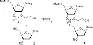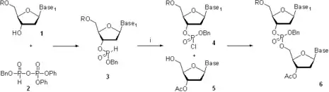 En la década de 1960, grupos dirigidos por R. Letsinger[22] y C. Reese[23] desarrollaron una solución basada en fosfotriéster. La diferencia que define de la solución basada en fosfodiéster era la protección de la entidad fosfato en el bloque constructor 1 (Esquema 4) y en el producto 3 con el grupo 2-cianoetilo. Esto precluía la formación de oligonucleótidos ramificados en el fosfato internucleosídico. La mayor selectividad del método permitió el uso de agentes copulantes y catalizadores más eficientes,[24][25] lo que redujo dramáticamente la duración de la síntesis. El método, inicialmente desarrollado para la síntesis en fase de solución, fue también implementado en poliestireno,[26] lo que inició un esfuerzo de investigación masivo en síntesis en fase sólida de oligonucleótidos y condujo eventualmente a la automatización del ensamblaje en las cadenas de oligonucleótidos.