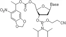 - El grupos fosfito es protegido por un grupo de base-lábil 2-cianoétil.[32] Una vez que un fosforamidito ha sido unido al soporte sólido de oligonucleótidos y los restos del fosfato se han convertido en especies P(V), la presencia de la protección del fosfato no es necesaria para que las reacciones de copulación se lleven a cabo de manera exitosa.[46]