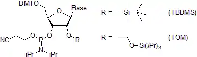- En la síntesis de RNA, el grupo 2'-hidroxilo es protegido por el grupoTBDMS (t-butildimetilsilil)[47][48][49][50] o con el grupo TOM (tri-iso-propilsililoximetil),[51][52] los dos pueden ser removidos con un tratamiento del ion floruro.