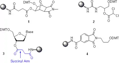 - Soportes sólidos nucleosídicos. En un primer acercamiento, el grupo 3'hidroxilo del residuo del nucleosido 3'-terminal se une al soporte sólido a través de 3'-O-succinil como un compuesto 3. El ensamblaje de la cadena del oligonucleótido empieza con la unión de un bloque de construcción de fosforamidita al segundo residuo de nucleótido de 3'-terminal. El grupo hidroxilo 3'-terminal en oligonucleótidos sintetizados en soportes de sólido nucleosídicos son desprotegidos bajo ciertas condiciones, que son más ligeras que aquellas que aplican para los soportes de sólidos universales. Sin embargo, el hecho de que un soporte de sólido nucleosídico tenga que ser seleccionado en una secuencia específica reduce la complejidad del proceso sintético e incrementa la posibilidad del error humano.