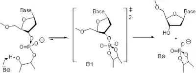 - También ha sido reportado que los fosforamiditos que se activan con 1H-tetrazol reaccionan con la posición O6 de la guanosina.[73] Después de la oxidación con I2/ agua, el producto secundario, posiblemente a través de la migración de O6-N7, pasa a la depurinación. Los sitios apurinicos que se forman, se rompen fácilmente al final de la desprotección del oligonucleótido bajo las condiciones básicas (ver abajo) para dar lugar a oligonucleótidos más cortos y de esta forma reducir el rendimiento del producto completado. Las modificaciones de O6 son removidas rápidamente por un tratamiento con el reactivo de taponado siempre y cuando el paso del taponado se lleve a cabo antes de la oxidación con I2/ agua.