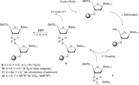 Treinta años más tarde, este trabajo inspiró, independientemente, a dos grupos de investigación para adoptar la química del H-fosfonato a la síntesis de fase sólida, usando monoésteres H-fosfonato de nucleósidos 7 como bloques de construcción, y cloruro de pivaloílo, cloruro de 2,4,6-triisopropilsulfonilo (TPS-Cl), y otros compuestos como activadores.[7][8] La implementación práctica del método del H-fosfonato resultó en un ciclo sintético muy corto y simple, consistiendo de solo dos etapas, detritilación y copulación (Esquema 2). La oxidación de los enlaces diéster H-fosfonato internucleosídicos en 8 a enlaces fosfodiéster en 9 (X = O) con una solución de yodo en piridina acuosa es llevada a cabo al final del ensamblado de la cadena, como un paso en el ciclo sintético. Alternativamente, 8 puede ser convertido en el fosforotioato 10 [9][10][11][12] o en fosforoenolato 11 (X= Se),[13] o oxidado por CCl4 en presencia de aminas primarias o secundarias a análogos de fosforamidato 12.[14][15] El método es muy conveniente en varios tipos de modificaciones de fosfato(fosfato/fosforotioato/fosforamidato) y puede ser introducido al mismo oligonucleótido para la modulación de sus propiedades.[16][17][18]