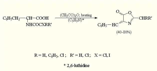 El paso final es la ciclización del N-haloacilaminoácido con anhídrido acético. Esto formará una oxazol-5(4H)-ona (azlactona). (3).[5]