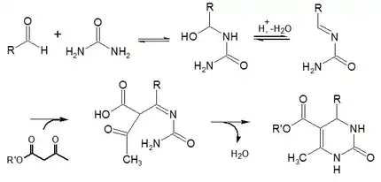El mecanismo de la reacción de Biginelli es una serie de reacciones bimoleculares que conducen a la dihidropirimidinona deseada.[11]