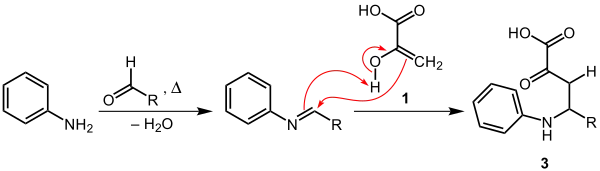 Un mecanismo alternativo se basa en la formación de una base de Schiff entre la anilina y el aldehído con eliminación de agua. La reacción subsecuente con el enolato del ácido pirúvico(1) lleva a la formación del derivado de la anilina (3):[3]